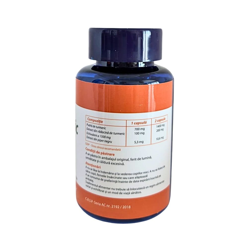 Ingrediente: Pudră de turmeric bio (Curcuma longa), extract din rădăcină de turmeric Curcuma longa Linn. (min. 70% curcumină), extract din piper negru Piper nigrum (95% piperină).